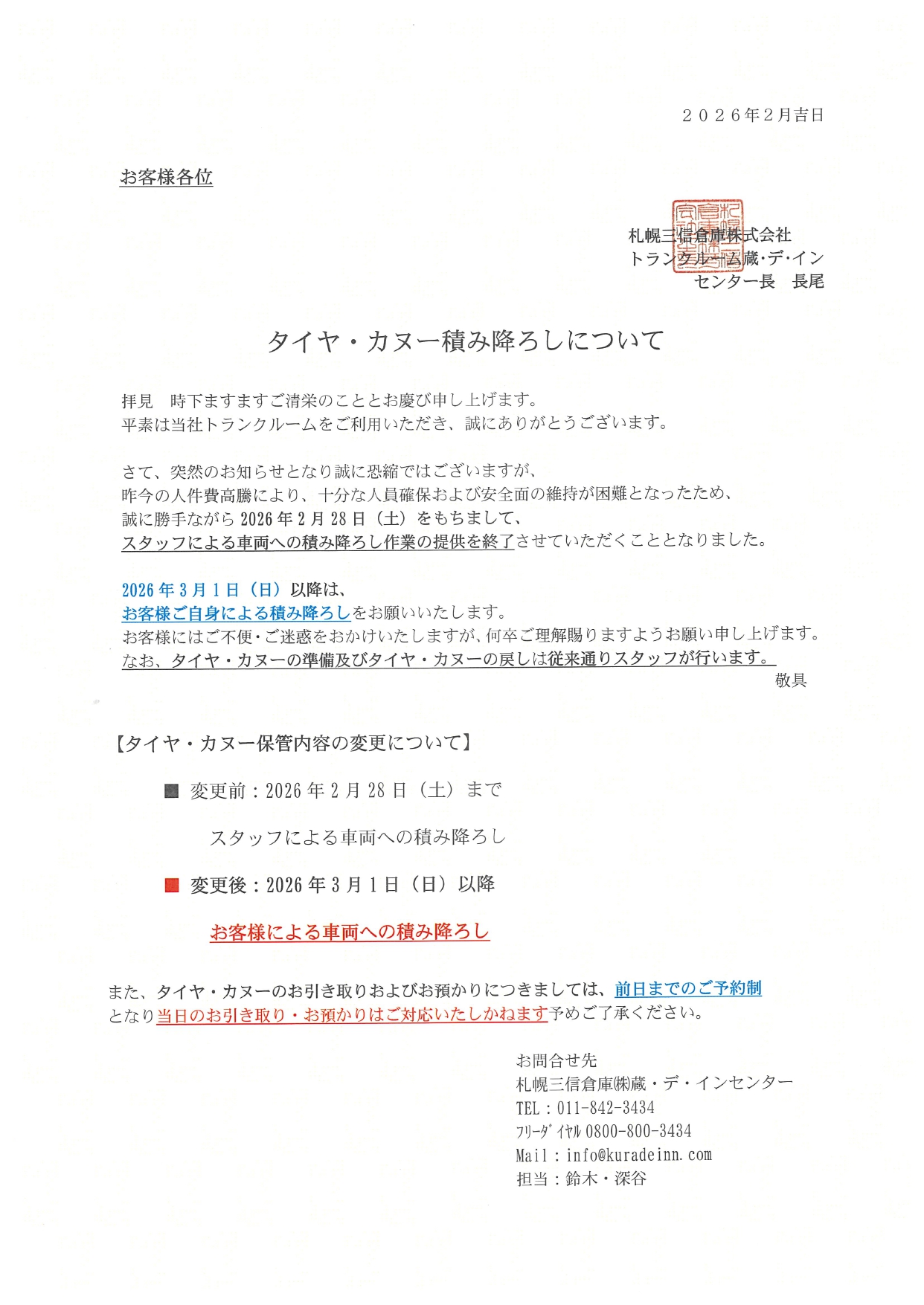 タイヤ・カヌー積み降ろしに関するお知らせ